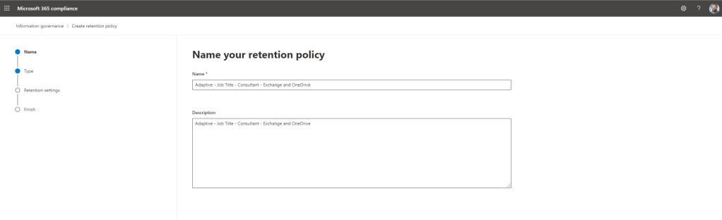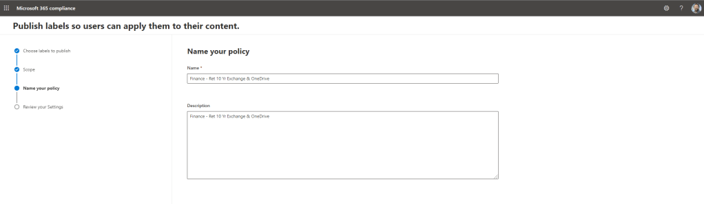 19.) Add a Name and Description for your policy. Recommended here to make it very explicit so its clear who it is applied to and what is retained by the policy. Additionally you could also add years. Good naming conventions are useful if have several policies. Note also that you cannot retain everything within a single policy which will be explained in the next few steps, so with this policy I am going to name it Exchange and OneDrive as these are the services which will be retained in the policy. Once done select Next