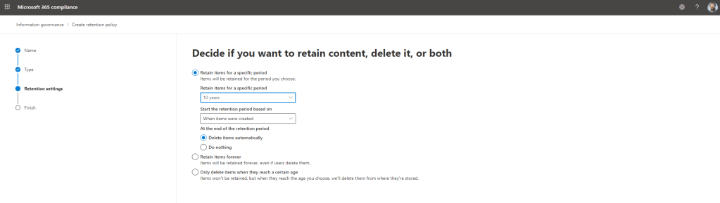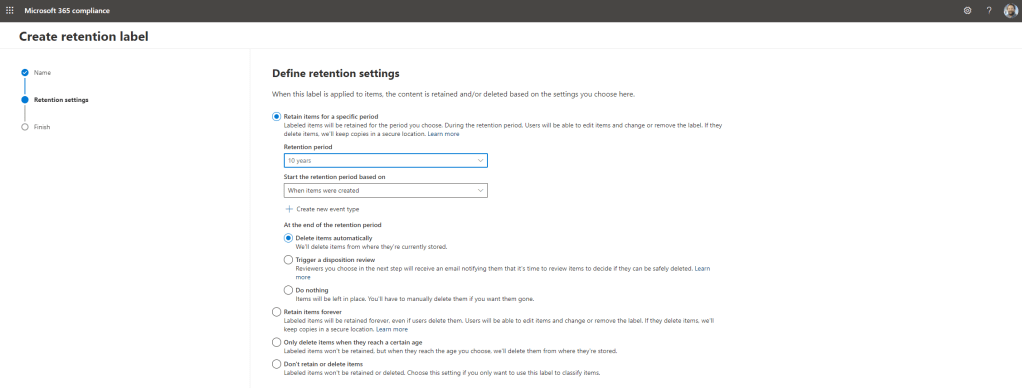 17.) Set the Retention Settings and then select Next. Here it is shown that the items marked with the label will be retained for 10 years and then deleted