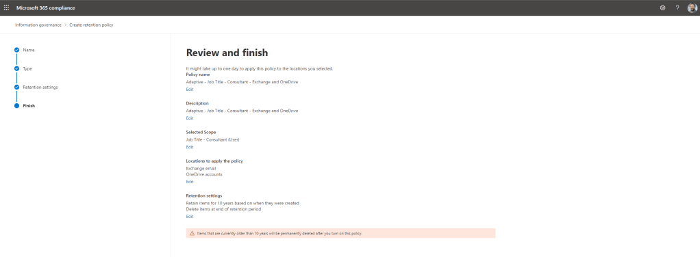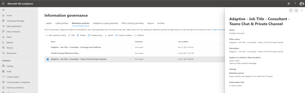 27.) To finish the task rinse and repeat to create a second retention policy covering Teams Chats and Private Channel Messages using the same adaptive scope. Again 10 years and again to delete after that time. That wraps it up! Our job here is done. Two retention policies have been created based on a single adaptive scope that covers Exchange, OneDrive, Teams Chats and Private Channel messages for everyone in my org who has the Job Title Consultant. No worries after this except making sure Azure AD stays up to date and ensuring users have the right job title for the retention policy to apply.