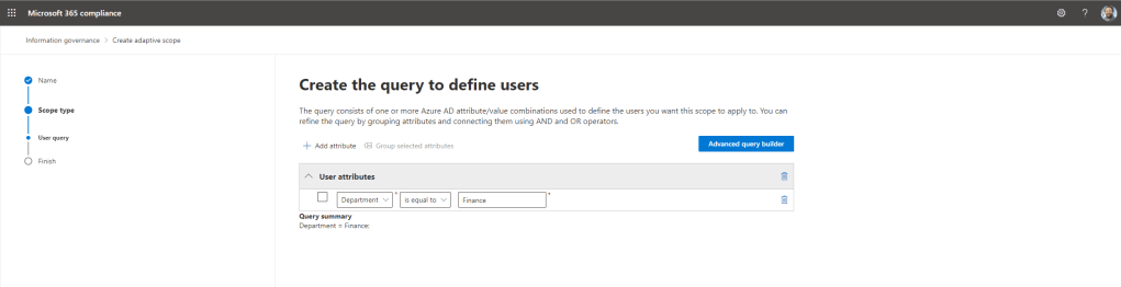 12.) Now is the time to set the attribute itself. There are a number of attributes to use, however this example uses Department so it has been set as that. Other examples include First Name, Last Name, Country and even custom attributes. This is set as shown so that the job title is equal (which again other options can be chosen) to Finance (added manually) which is the department of several users in Azure AD. Anyone with in this department in the organisation will go on to have the retention label issued when the policy is created. Note, that a limitation here is that the operator only uses equal/not equal and starts with/does not start with. It would be awesome later on it could have ‘contains’ as many departments have similar words in their title – Finance, Financial Consulting, Financial planning, however there is a way to include multiple job titles – see FAQ’s. Once done select Next