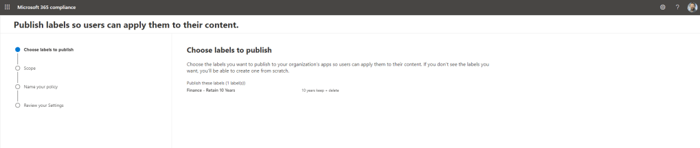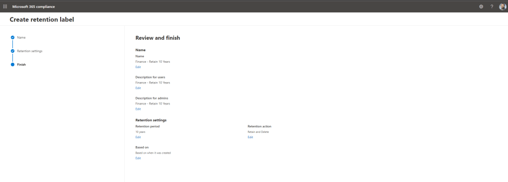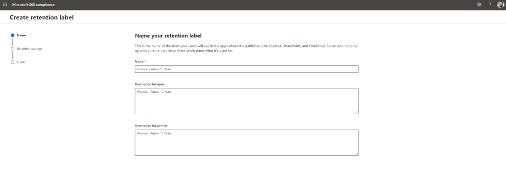Example Requirement: Ensure that the Finance Team has the label ‘Finance’ that they can apply to Teams Meeting Recordings and personal documents and can retain it for 10 years. Delete after that time.