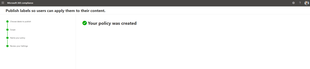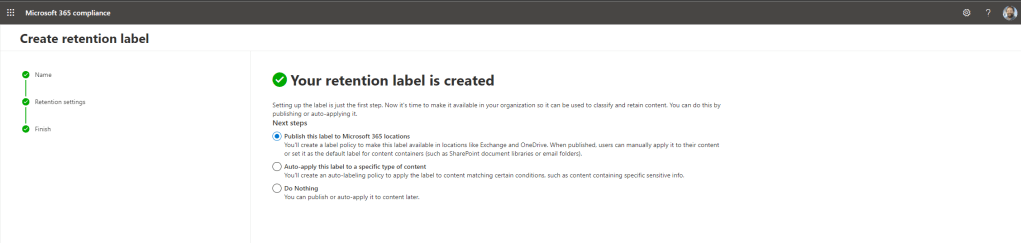 19.) The label is now created. The final part is to create a label policy with an adaptive scope. Select Publish this label to Microsoft 365 Locations and select Done
