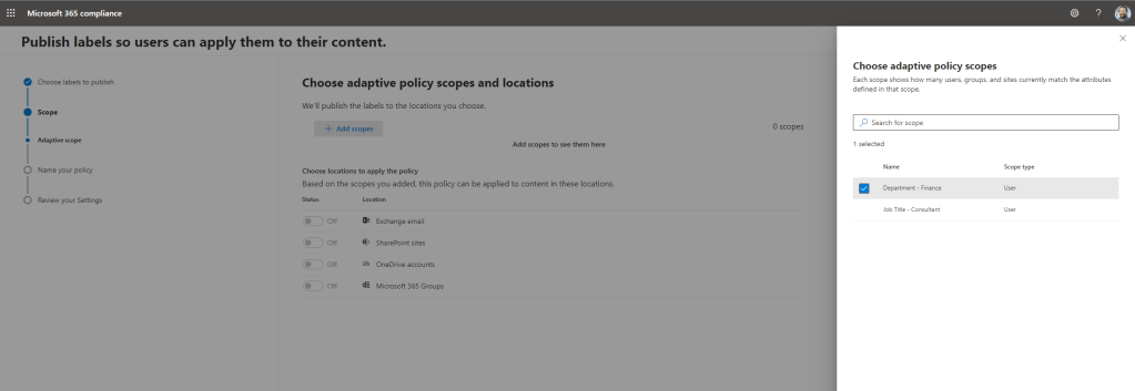 22.) Select Add Scopes. Add the adaptive scope created and this will refine what can be retained and the labels applied to