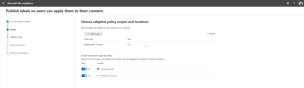 23.) Set the locations where the labels can be applied. As you can see below it is only possible to select Exchange and OneDrive when using adaptive user scopes with label policies. Select Next