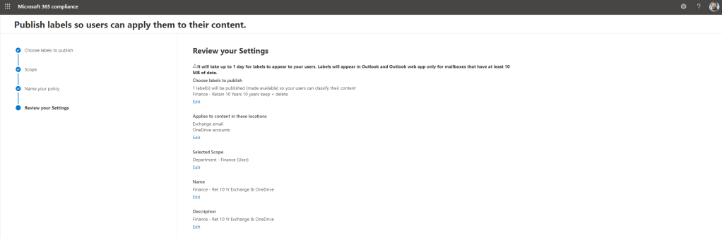 25.) Review the labeling policy and select Submit. Note it takes up to 1 day for the label to appear to scoped users