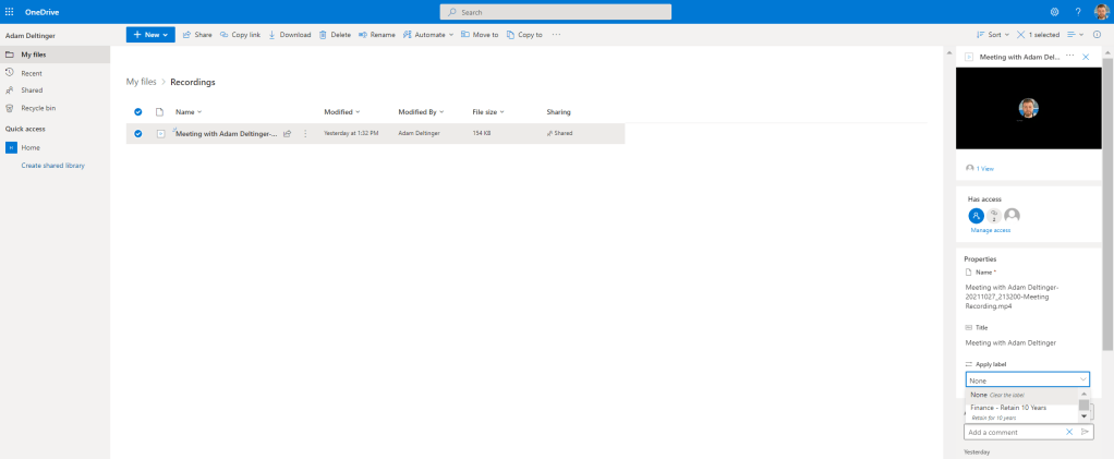 27.) Our job here is done. The Label has been pushed to the users in the Finance Department who can now use it in Exchange and OneDrive to apply to their Teams Meeting recordings and documents. Here is a screen shot of one of the users in the Finance Department who can now apply the Finance – Retain 10 Years label to the Teams Meeting