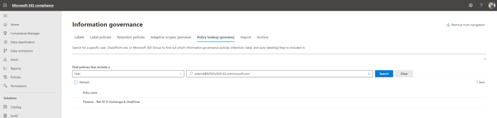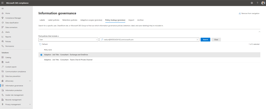 A final note concerns the new Policy Lookup functionality which is also under Information Governance within the Compliance centre. As using adaptive scopes will – at least in theory – create more complexity in the organisations tenant since several scopes (static and adaptive) may be applied to users, sites or Microsoft 365 Groups, it is really important to be able to see what policies apply to which users. This could be useful when we want to see what policy wins out according to the general principles of retention, if we want to find out whether a user is in a policy or not, or whether we simply want to test that the policy applies to the user, the site, or Microsoft 365 Group