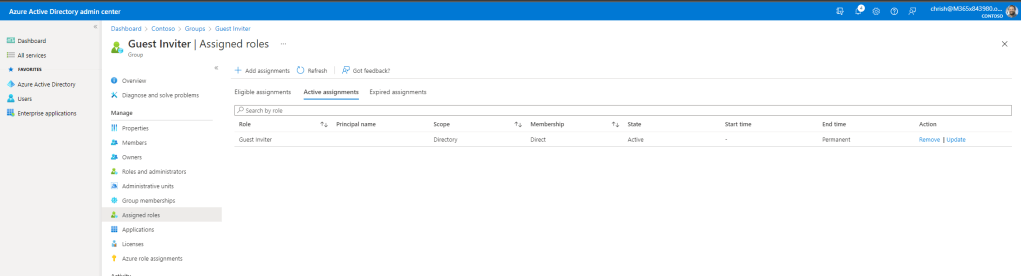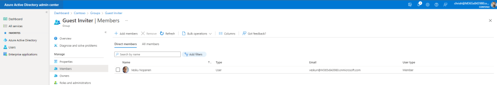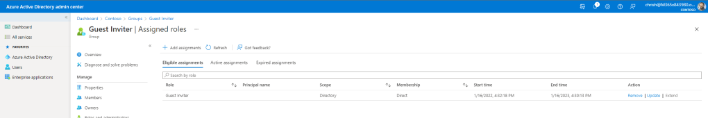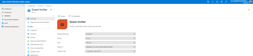 4.) Accept the terms and check back into groups to see that it has been created with the correct members. If you already have Privileged Identity Management in play, then under Assigned Roles you will see that the Guest Inviter role has been assigned as a permanent role initially