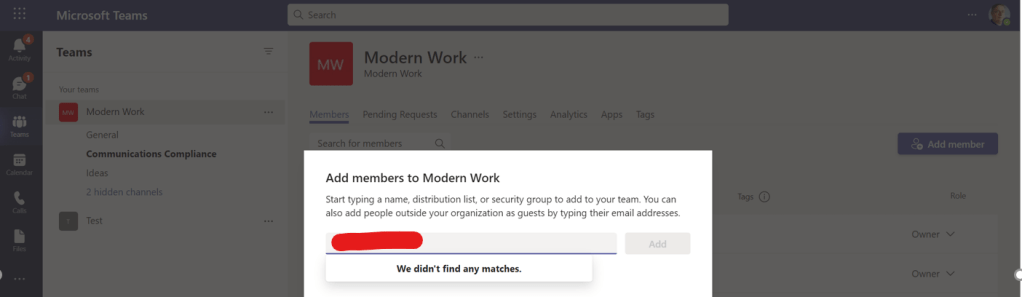 3.) However, Adam who wasn’t added to the Azure AD Security Group, cannot invite guests: the experience in Teams for someone without the role is that they simply cannot find guests who they invite outside of their tenant