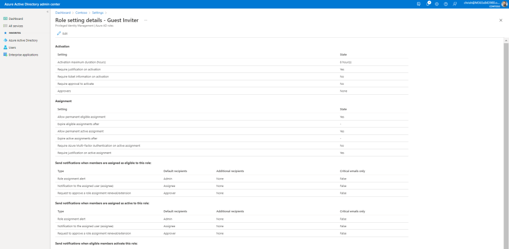 So having now controlled who exactly in the organisation can added guests, and given we control it with an Azure AD Role, we can also go one step further and use PIM. Privileged Identity Management (PIM) removes standing access to the role itself, which means that only the people within the security group will not always have the role – they will be eligible for it, and will need to apply to use it within a specific period of time. The benefits from a security perspective include PIM’s controlling of when somebody can add a guest and the fact it needs an approval.