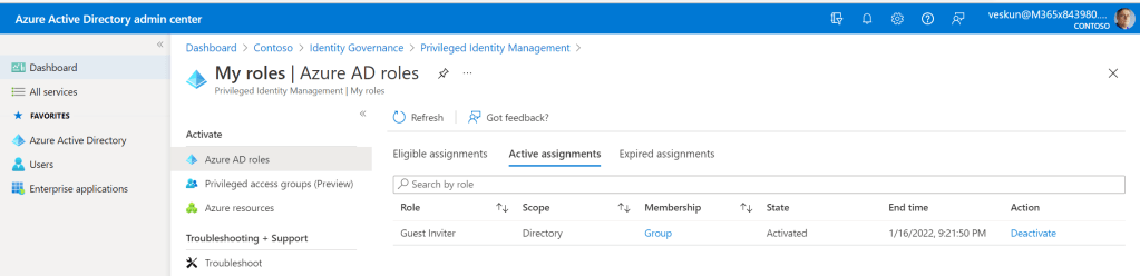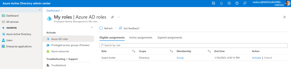Vesku, who is part of the Azure AD Security Group, logs in and goes to his eligible Azure AD roles within Identity Governance