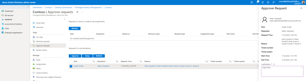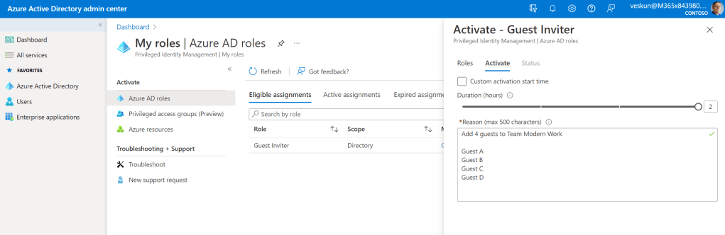 He selects Activate in Azure AD and applies for the role. He requests a 2 hour window to add 4 guests to his team. The role is pending for Approval