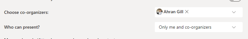 Who can present?: [This is changed by default to ‘Only me and co-organisers]. All other meeting members are set by default as attendees (but can always be promoted in the meeting).