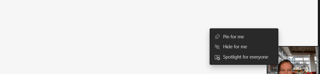 It is important to state that pinning yourself is not designed to spotlight yourself: these are two different things. Whilst spotlighting is about drawing attention to yourself, pinning is the ability to look at yourself which you may want for performance management or to see how others see you. Others in the meeting will not see your video pinned. So this is a nice functionality: does what it says on the tin and you may be able to get an idea of how you look to other people in a meeting.