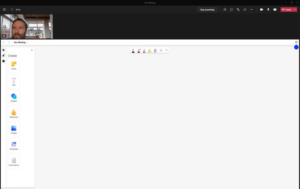 1.) Join the meeting. Here you can see I am presenting a whiteboard and my video is currently in the bottom right hand corner