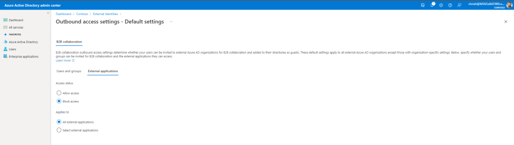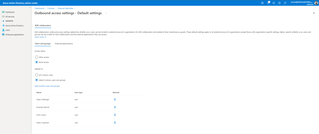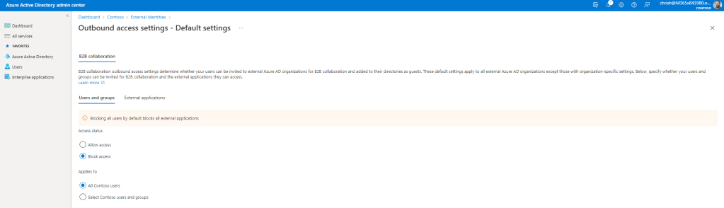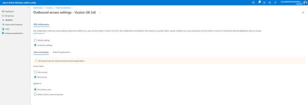 5.) The end result is this: the users who are blocked are blocked from accessing any external tenant so cannot be guests in any other organisation, whereas those who I do allow can access all applications in all other organisations, so they can be guests in apps such as Teams