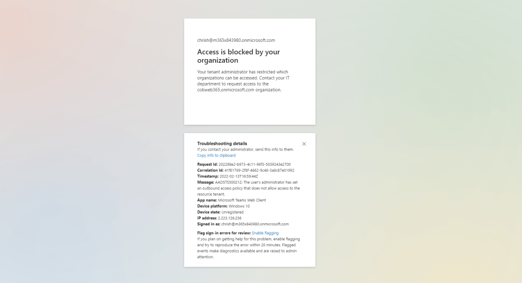 12.) So if someone outside my organisation invites a user to their tenant as a guest to collaborate in Teams my user will not be able to do so and they will receive a notification stating Access is blocked by your organisation as configured by me within CTAS in Azure AD