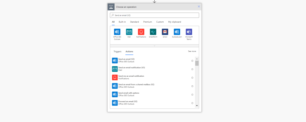 5.) This is where your example may diverge and this becomes purely fiction. The fictional example is that I want an email to go to my team with the protocols for meetings before an upcoming meeting. In this fictional scenario we hold these meetings regularly and instead of writing out an email every time I simply want to add a keyword to the teams channel and it emails. To complete the flow, in the New Step I would search for and select Send an Email (V2) which is an Exchange Action