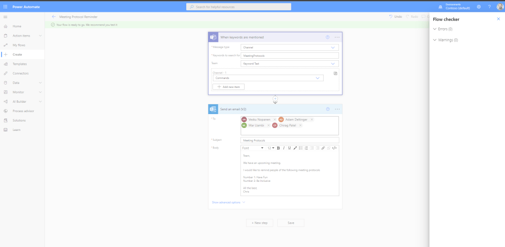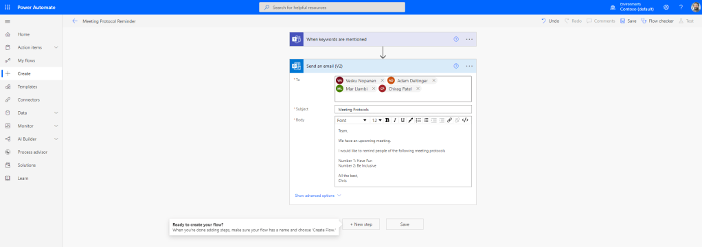 3.) Add a Title for the flow. In this example I will use Meeting Protocol Reminder. This is a completely fictional example off the top of my head – that when I mention a keyword it will send out an email to my team members to remind them of meeting protocols for an upcoming meeting. Chose the trigger When Keywords are mentioned and select Create