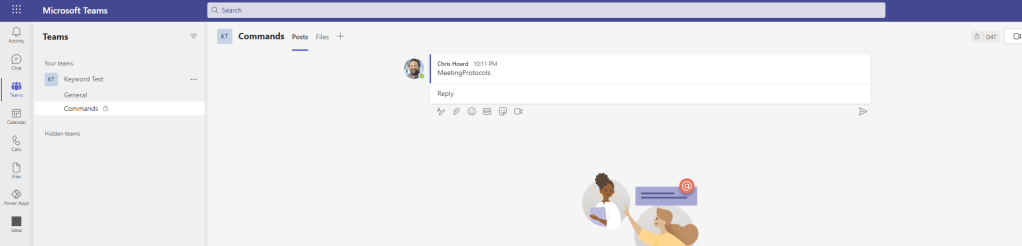 8.) All good? Let’s test this out. In the team I go to the Command channel start a new conversation and then enter my keyword which is MeetingProtocols and then enter