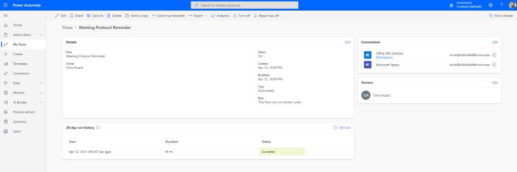 So I have used the fictional example of sending an ad-hoc email to the team to remind them about meeting protocols for an important upcoming meeting. Another example could be asking team members to update a PowerPoint asset in preparation for the monthly meeting by triggering a post into the general channel of the team. A hyperlink goes through to the PowerPoint which opens in the browser