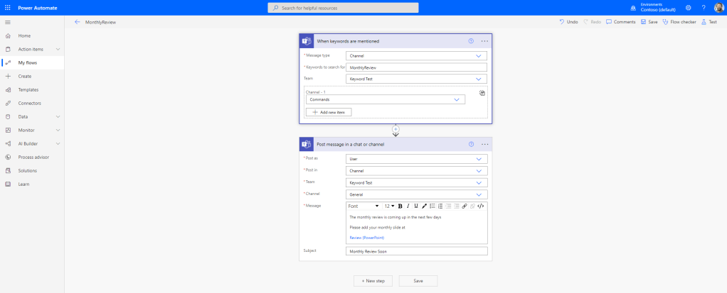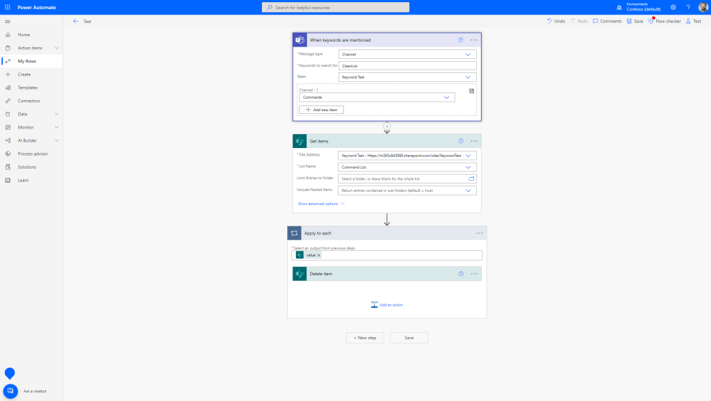 I decided to use a private channel because the Power Automate trigger is explicitly when a keyword is mentioned so I want a place where I can use them to launch flows which isn’t going to be used by others