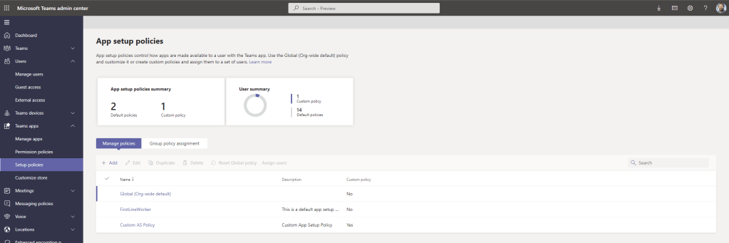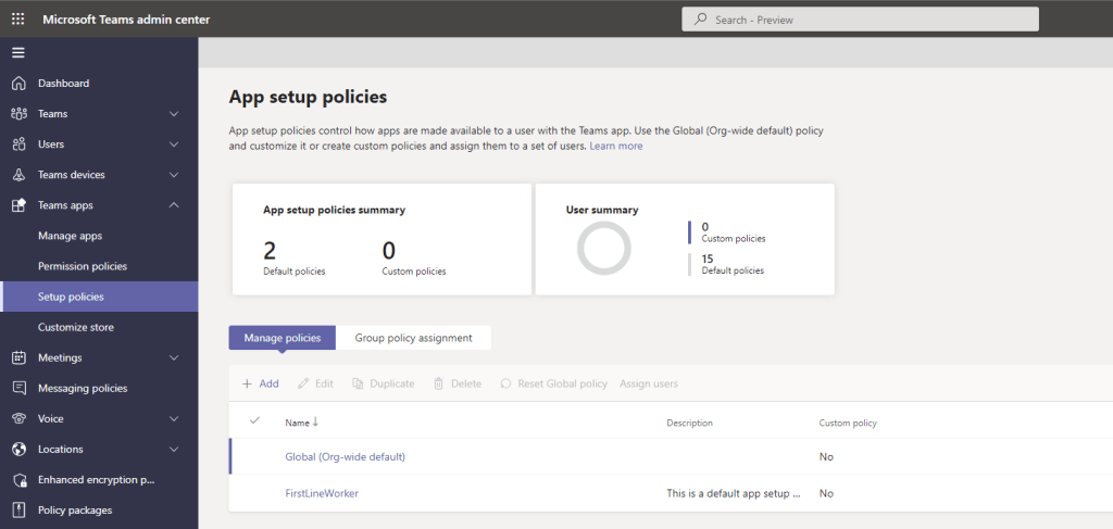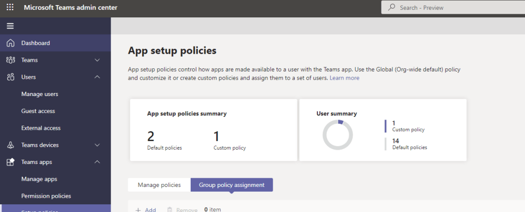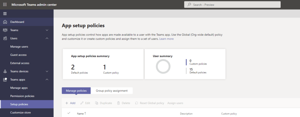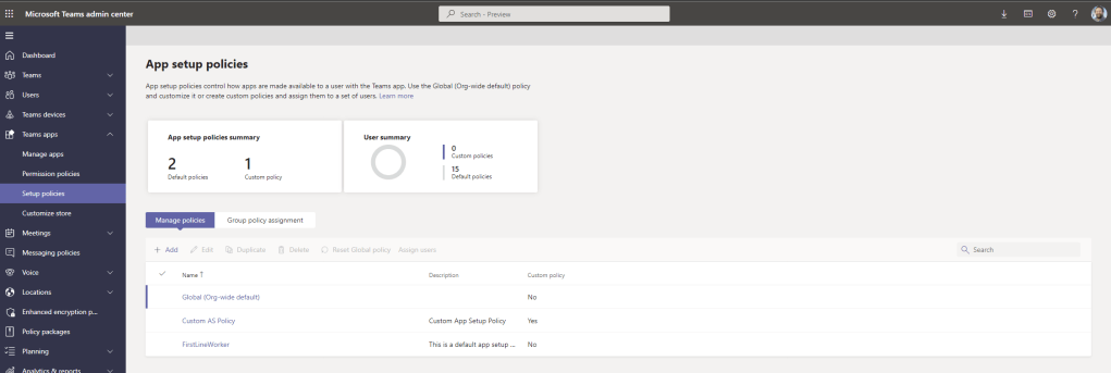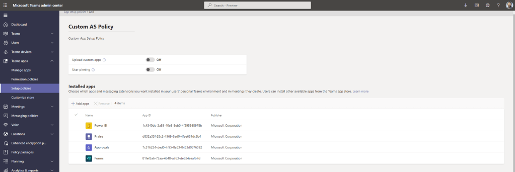 4.) In the Teams Admin Centre, select Teams Apps, then Setup Policies