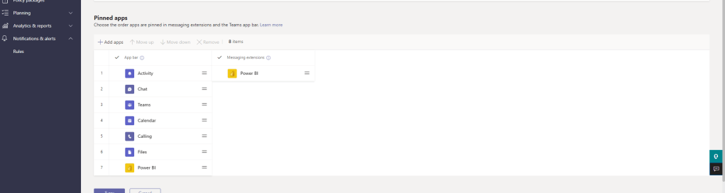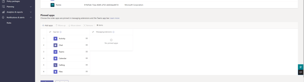 A. Yes. If user pinning is turned off the admin can modify the app policy and flip the messaging extensions around using the parallel lines as shown in the below shot, then save the reordered. If user pinning is turned on then the user can reorder all pinned apps, both admin pinned and user pinned