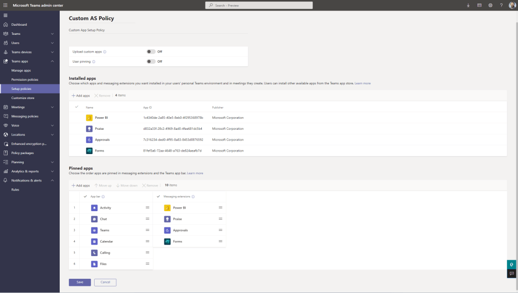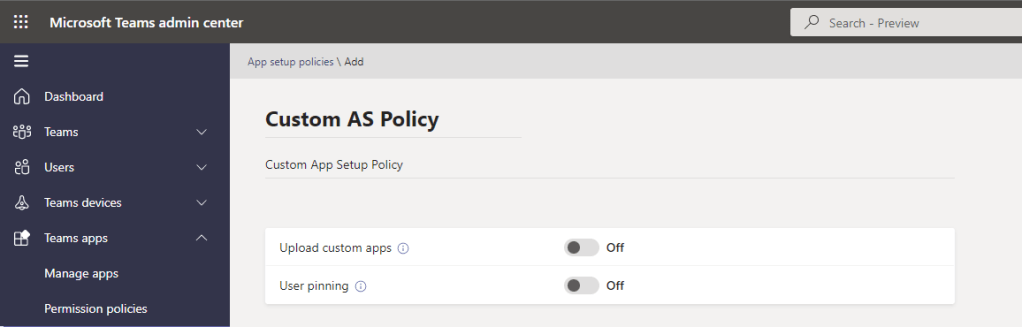 7.) Specify whether the user of the policy can a. – upload custom apps, otherwise known as sideloading and b. – whether a user can pin their own apps on the app rail or as messaging extensions. This example sets both sliders to Off as both will be defined solely by the custom app policy