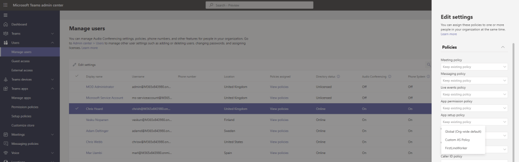 17.) Select the user, select Edit Settings, search for and select the new app policy under App Setup Policy. Once selected, select Apply which applies the custom app setup policy to the user