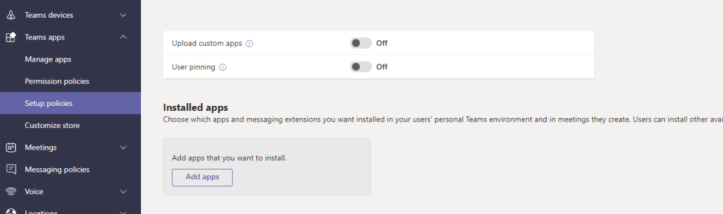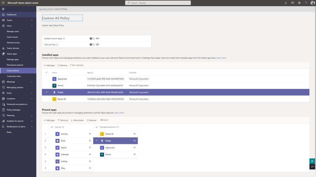 11.) To finish off the App Setup Policy, Pinning will now be configured. By default there are a number of default apps set for the left app rail but none for Messaging Extensions. Select Add Apps