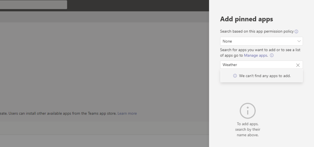 A. Interestingly, not all messaging extensions are supported by App Setup Policies. Weather is a good example. If it is not supported you will not find it in the search. However, that doesn’t mean it cannot be used as a messaging extension, it simply means it isn’t supported in the app setup policy and so if a user wants to use it, then assuming they can do so via the app permission policy they can search for the app in Teams, install it and use it