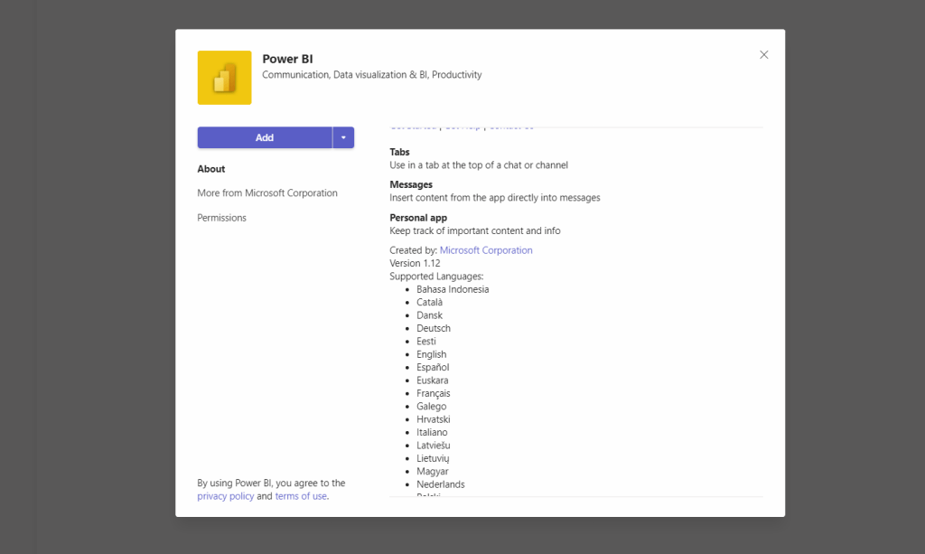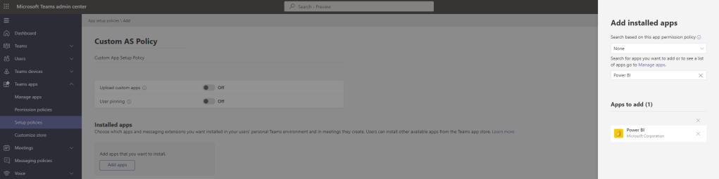 9.) Search for and select the app to be used as a messaging extension. This example will select Power BI. Once done select Add