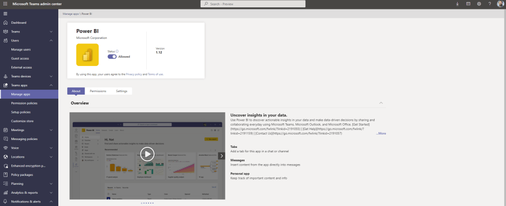 12.) Search for and add an app to be used as a messaging extension. This example will again use Power BI. Select Save once done
