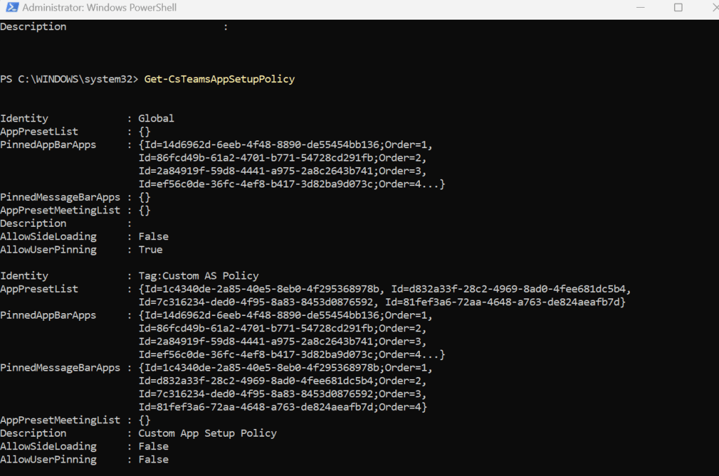 A. This is a bit of a grey area. Docs says that the PowerShell actions for App Setup Policies should not be used (check here) However, having just checked with Get-CsTeamsAppSetupPolicy this works just fine and returns the following. I would need to test – but given this I would assume a.) It works and b.) That Message Extensions are defined by -PinnedMessageBarApps, and for example we could use the New, Set and Grant commands. It’s probably docs being out of date in this area and referring to the old Skype for Business module.