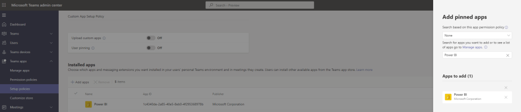 10.) Rinse and Repeat until complete. This example searches for and selects Power BI, Praise, Approvals and Forms which are four apps which users to be able to use as Messaging extensions in their Teams conversations and private chats
