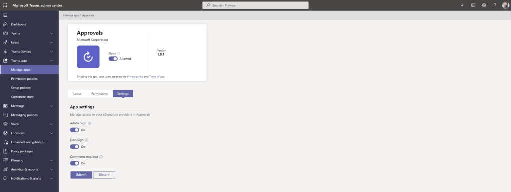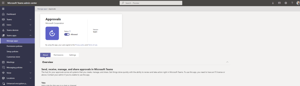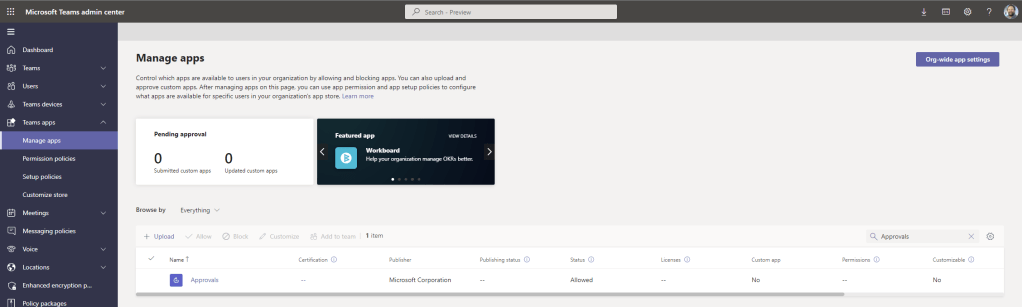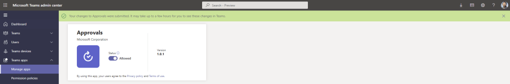 A. Yes it is only configurable in the Teams Admin Centre and when applied this applies to all approvals in the organisation. You can’t for example, set it like a policy where it applies to some users and not to others