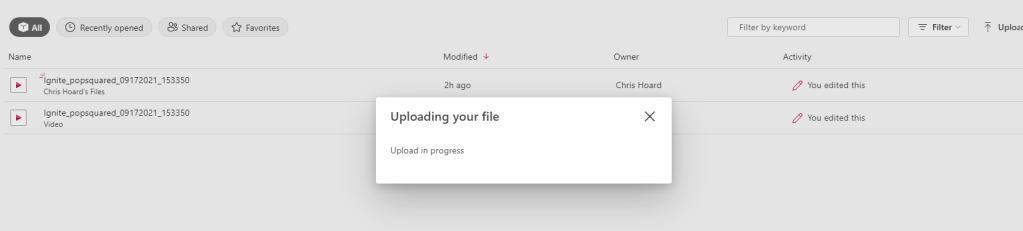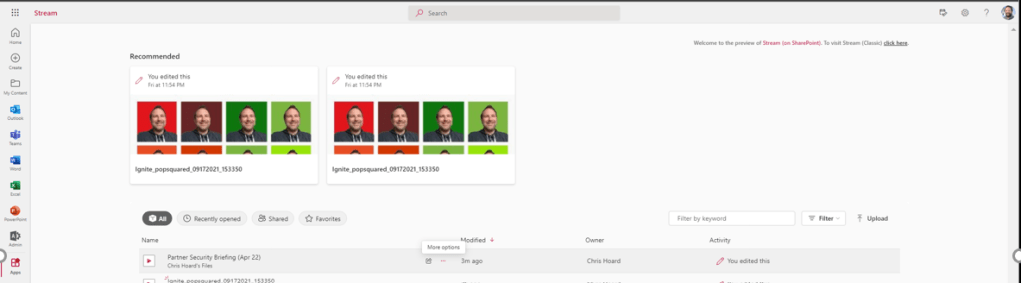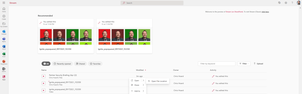6.) The file has uploaded, which has been uploaded to OneDrive for Business given that I have personally uploaded it. Hover over the video file and select the More Options (…) then Open. Open File Location will take you through to OneDrive where you may open it there