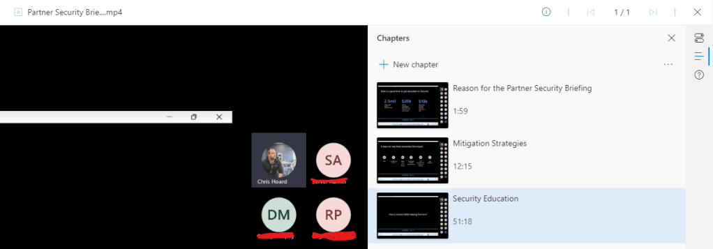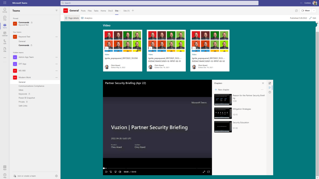 Stream, or should I now say Stream on SharePoint? The last time I wrote on it was about the web app at stream.office.com which has now been available for some time. Since then, Mark Mroz and the team have been working on migration tools. They have also been working on the player and a ton of other things. Now, going back to that old marketing pitch, the point of Stream v2.0 was all about Stream becoming the video player for the whole Microsoft 365 ecosystem, as opposed to an app with it’s own dedicated storage. I don’t mind admitting I’m still kinda gutted about this because genuinely I thought the former experience was really really good whilst I also really felt for the team given they had to ice it and pivot to which I can only imagine the amount of pain involved. But I am endeavoring to be onboard with the new, and so when using Stream in my demo tenant a few days ago I saw that chapters had dropped. Chapters, which break up a video into sections and let you easily rewatch different parts, is one of the functionalities that the old version didn’t have and the kind of functionality which feels good. It’s part of a nice incremental development cadence which seems really well planned, so kudos again to the team