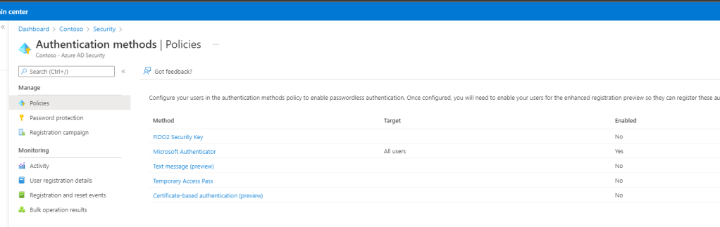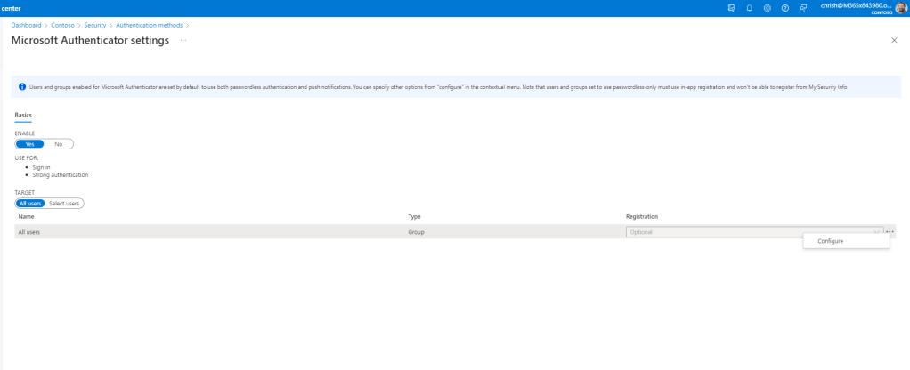 8.) Here, in this tenant, Microsoft Authenticator is enabled. If it isn’t enabled you can enable it at this point have users download the app and enrol. The target – who is permitted to use Microsoft Authenticator – is also to All Users which can be modified if only a user or group is required. This demo will stay with all users.