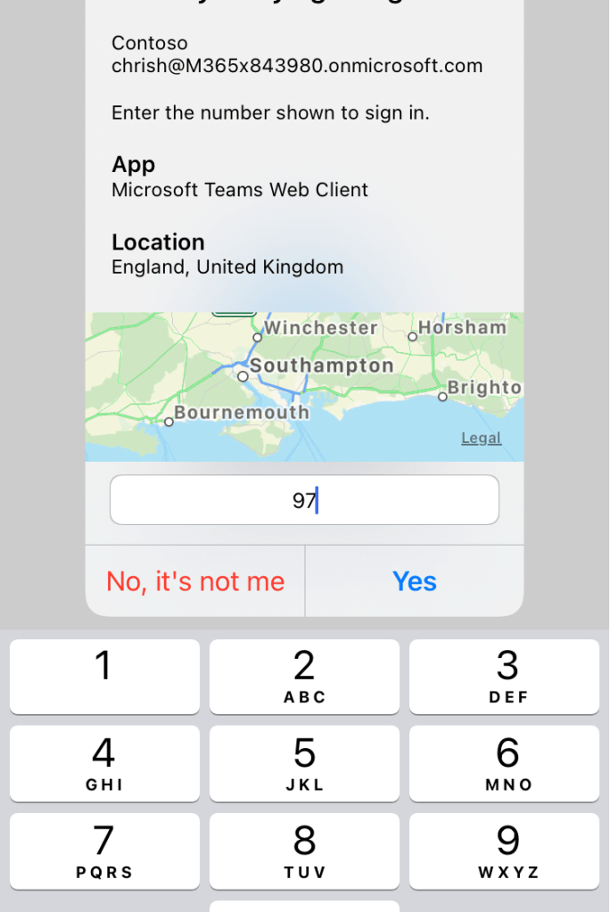 4.) I now open the authenticator app which shows far richer information. It shows the correct app I am actually trying to access – Teams. It shows my location and I have to Enter The Number provided and select Yes