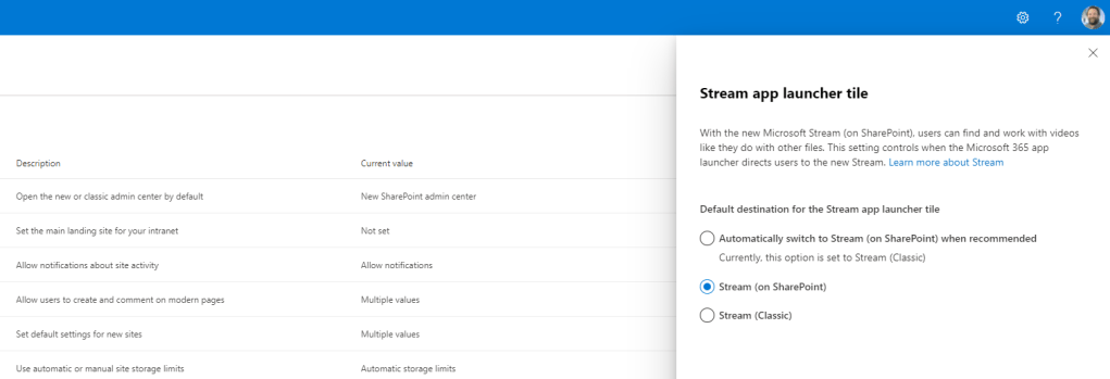 Hope your enjoying the Jubilee bank holiday this weekend! After taking my five year old to a two hour – yes you read that right – two hour pantomime today let’s just say I’m 99% there on the old cognitive load. I’ll be giving the BBC coverage of Party at the Palace a miss. I’ll be giving TV a miss. In fact, I’ll be enjoying silence in the most myriad and profound kind of ways. So in order to unpack I’d thought I do a quick blog. A virtual commute as you will. Into nothingness. In 45 minutes I am going to discuss how an org can direct to the new Stream on SharePoint experience for their users in office.com – which I see has now dropped into Ring 4 in a test tenant. It was only a few weeks ago – maybe a month – where I discussed the new Video Chapters. A few months prior to that I discussed how it was possible to use the URL steam.office.com to get to the new web app experience. The point is with the introduction of the web app and the player I feel we are moving towards a tipping point in the transition from classic to Stream on SharePoint. I feel we are starting to get to the good stuff. So what is this blog in particular addressing? Well Stream in the App Tile Launcher – what you and I know as the Waffle – in office.com continues to direct to classic (https://web.microsoftstream.com) whereas you can now set it in the SharePoint Admin Centre to direct to Stream on SharePoint (https://stream.office.com). As much as users knowing the URL it’s never going to be as memorable as just redirecting via the App launcher. So let’s take a quick look, as there isn’t much to do – rather you just need to know where to switch it. Later on, I am sure it’ll become the default