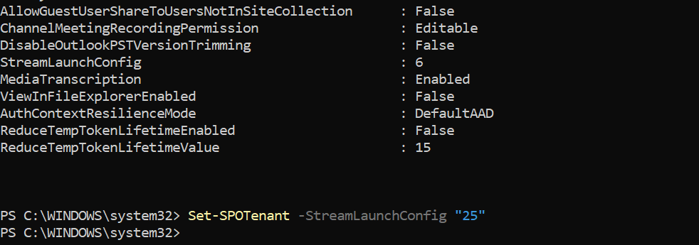 Set-SPOTenant -StreamLaunchConfig "25"