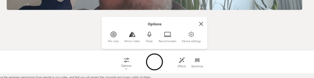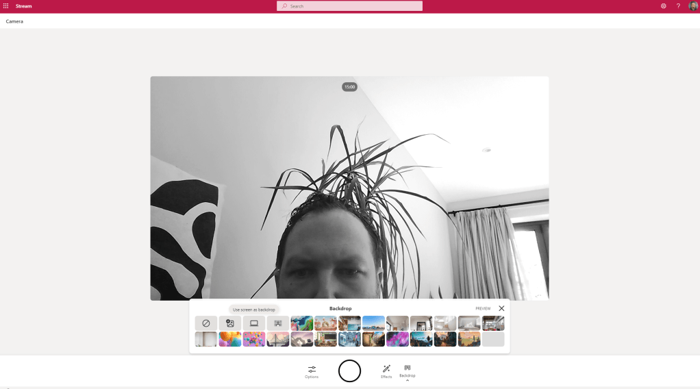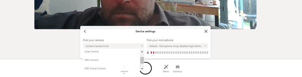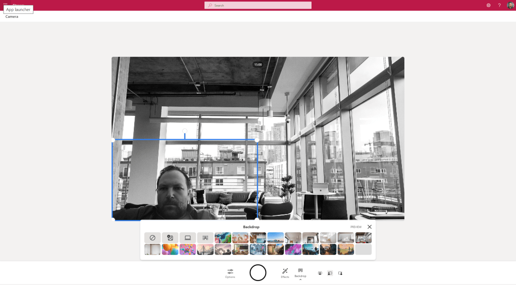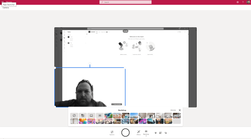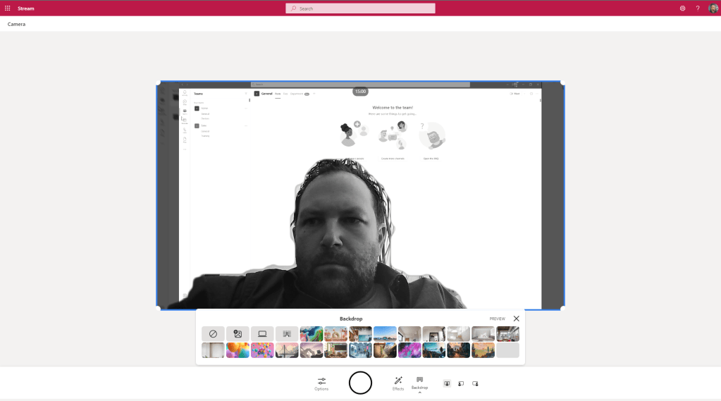 5.) I can also use Backdrops such as the Custom Backgrounds in Teams. Note what is interesting is that the filters also apply to the backdrop as do the photos