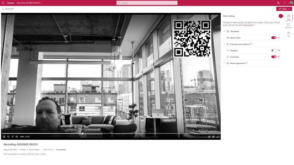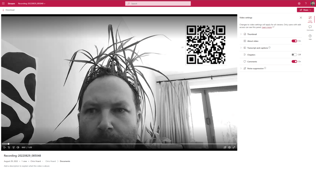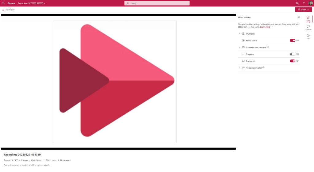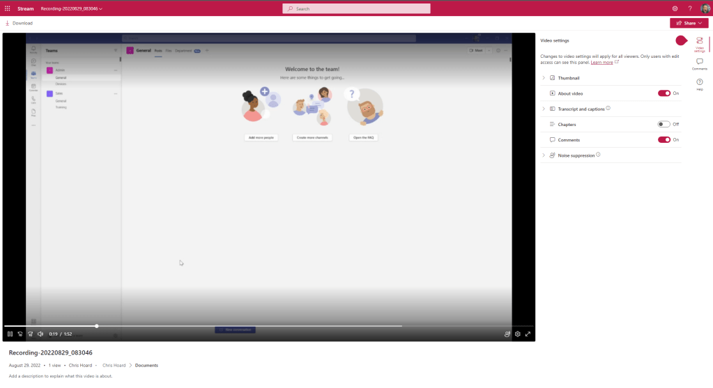 I had a big problem this weekend. After a few weeks of grinding, I was pretty much there or there abouts. Then on Friday I went to review the MS-900 Microsoft 365 Fundamentals course which I am going to teach again next Tuesday only to discover the whole thing had changed. So, let’s just say the bank holiday went right out of the window. Bygones. But in doing the consolidation and rewrite of MS-900 I see that the ability to record video in Stream on SharePoint has now arrived in what I assume is targeted. There is always some sort of upside to any given situation, and this is a pretty big deal. Stream on SharePoint is getting to the business end of the transition. I see that message centre says that in October classic Stream will start to be phased out, such as no longer appearing in tenants which have never used it. The player is here. Lots of cool features we never had before like chapters are here. But recording is a big gap and a filling in of functionality we had in classic. It’s one of those fundamentals like trim, or transcripts or the Stream app in Teams. So, 2022 continues to be a wild year for Stream. This is a brief look at some of the functionality which is available – but I am sure we will see much more development on this front.