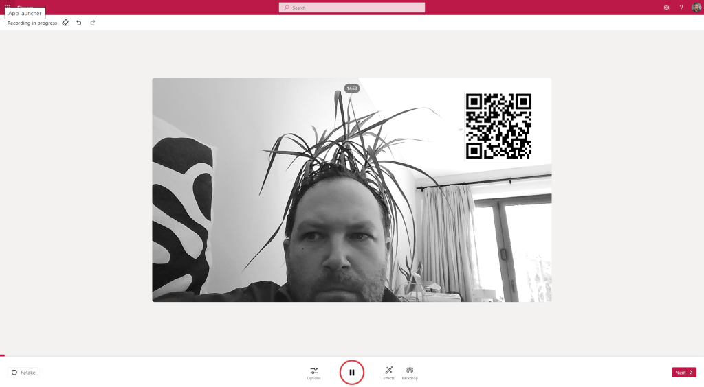 7.) The screen is now recording marked by the Timer. All of the effects above can be added in situ. Once done select Next. This then plays back the video for review and can be published/uploaded into OneDrive and starts playing on the Stream Web App like the screen recording above