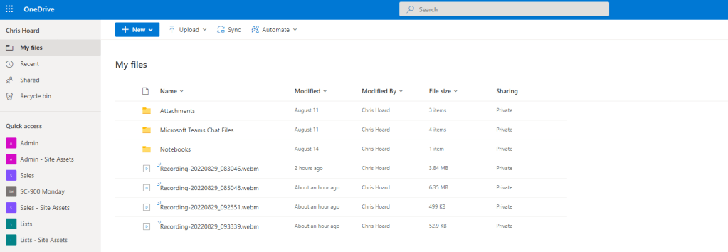 2.) Recordings go straight into the top level of OneDrive as .webm files