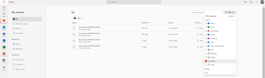 3.) In office.com you can also Search and Filter videos in My Content