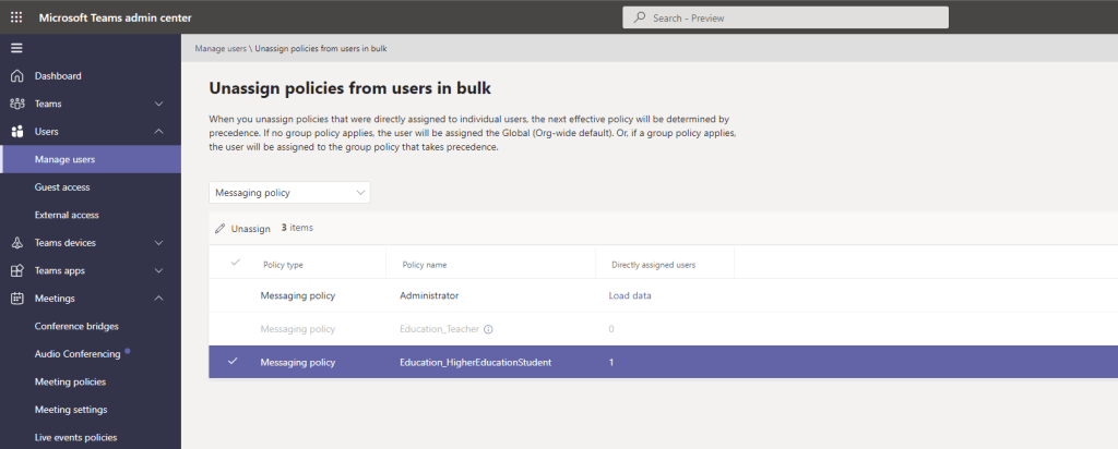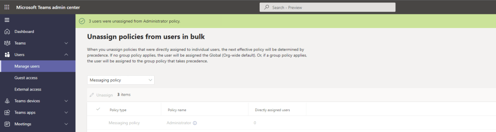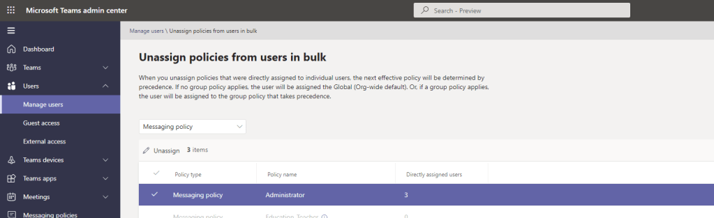 Over the years, I have spoken about and covered several blogs on Microsoft Teams policies. As any good Teams administrator will know, policies play a big part in terms of managing users and defining the experience of the front end. Whether it is configuring messaging policies, or app setup policies, or the gamut of calling policies – you won’t get very far into the administration without coming up against them and having to understanding and define them. And once we understand them, we begin to understand such things as the difference between org-wide and custom policies, and about policy precedence and the several ways policies can be applied such as direct, batch, package and group. And once we learn all the ways that we can apply them, we then understand that some policies are not even the TAC at all, that we have to use the shell to create new policies and grant those policies to users. So now having returned from annual leave, and Ignite, and South Coast Summit, and plowing through the backlog of all of those things, there is an extremely rich vein of material and functionality to be explored over the coming months. However, I wanted to start with something easy, short, and which I was waiting for before I flew out to Florida. This is bulk unassignment of policies which was announced back in July but didn’t surface in the TAC until late September. Now bulk unassignment of policies actually means bulk unassignment of directly assigned custom policies (not org wide) – and what we must remember here is that directly assigned policies take precedence over group policies, which in turn take precedence over org-wide policies. In other words, the ability to bulk unassign custom policies is a utility to clean up and standardize Teams environments, as well as transition out of overly complex configurations with high numbers of bespoke assignments. How can we do achieve this? Does it work with Policy Packages which are also directly assigned and take precedence over group?