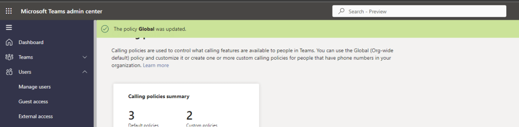 4.) In the Teams Admin Centre select Voice and then Calling Policies. Select the required policy. This example will use the Global (Org-wide default) policy, but if only changing for a subset of users you would create or modify a custom policy